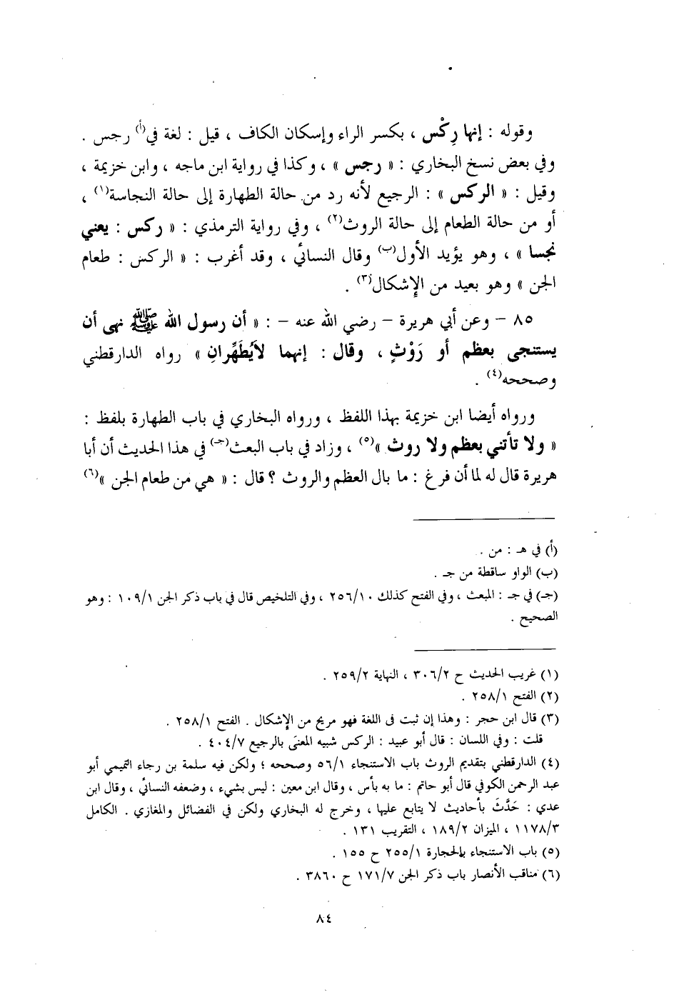 ورواه أيضًا ابن خزيمة بهذا اللفظ، ورواه البخاري في باب الطهارة بلفظ: "ولا تأتني بعظم ولا روث" (¬5)، وزاد في باب البعث (جـ) في هذا الحديث أن أبا هريرة قال له لما أن فرغ: ما بال العظم والروث؟ قال: "هي من طعام الجن" (¬6)