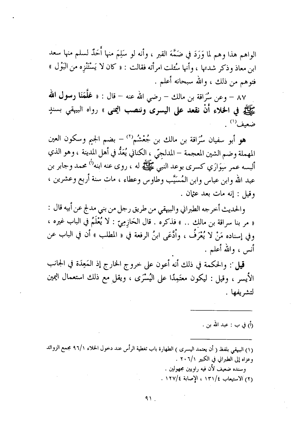 87 - وعن سُرَاقة بن مالك - رضي الله عنه - قال: "عَلَّمَنَا رسول الله - صلى الله عليه وسلم - في الخلاء أنْ نقعد على اليسرى وننصب اليمنى" رواه البيهقي بسندٍ ضعيف (¬1).