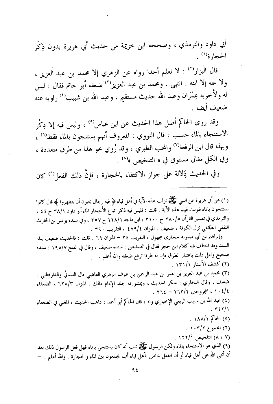 (¬1) عن أبي هريرة عن النبي - صلى الله عليه وسلم - نزلت هذه الآية في أهل قباء {فيه رجال يحبون أن يتطهروا} قال كانوا يستنجون بالماء فنزلت فيهم هذه الآية. قلت: فليس فيه ذكر اتباع الأحجار الماء أبو داود 1/ 38 ح 44، والترمذي في تفسير القرآن 5/ 280 ح 3100، ابن ماجه 1/ 128 ح 357، وفي سنده يونس بن الحارث الثقفي الطائفي نزل الكوفة، ضعيف. الميزان 4/ 479، التقريب 390.