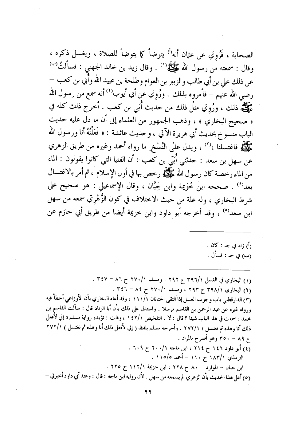 الصحابة، فَرُوِيَ عن عثمان أنه (أ) يتوضأ كما يتوضأ للصلاة، ويغسل ذكره، وقال: سمعته من رسول الله - صلى الله عليه وسلم - (¬1). وقال زيد بن خالد الجهني: فسألتُ (ب) عن ذلك علي بن أبي طالب والزبير بن العوام وطلحة بن عبيد الله وأُبى بن كعب -رضي الله عنهم- فأمروه بذلك. ورُوِيَ عن أبي أيوب (¬2) أنه سمع من رسول الله - صلى الله عليه وسلم - ذلك، ورُوِيَ مثلُ ذلك من حديث أُبَي بن كعب. أخرج ذلك كله في "صحيح البخاري"، وذهب الجمهور من العلماء إلى أن ما دل عليه حديث الباب منسوخ بحديث أبي هريرة الآتي، وحديث عائشة: "فَعَلْتُهُ أنا ورسول الله - صلى الله عليه وسلم - فاغتسلنا" (¬3)، ويدل على النَّسْخَ ما رواه أحمد وغيره من طريق الزهري عن سهل بن سعد: حدثني أُبَيّ بن كعب: أن الفتيا التي كانوا يقولون: الماء من الماء رخصة كان رسول الله - صلى الله عليه وسلم - رخص بها في أول الإِسلام، ثم أمر بالاغتسال بعد (¬4). صححه ابن خُزَيمة وابن حِبَّان، وقال الإِسماعيلي: هو صحيح على شرط البخاري، وله علة من حيث الاختلاف في كون الزُّهْرِيّ سمعه من سهل بن سعد (¬5)، وقد أخرجه أبو داود وابن خزيمة أيضًا من طريق أبي حازم عن