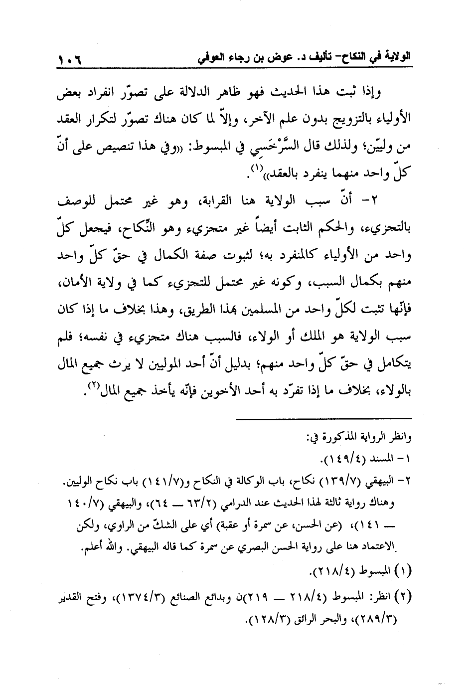 وإذا ثبت هذا الحديث فهو ظاهر الدلالة على تصوّر انفراد بعض الأولياء بالتزويج بدون علم الآخر، وإلاّ لما كان هناك تصوّر لتكرار العقد من ولييّن؛ ولذلك قال السَّرْخَسِي في المبسوط: "وفي هذا تنصيص على أنّ كلّ واحد منهما ينفرد بالعقد"1.