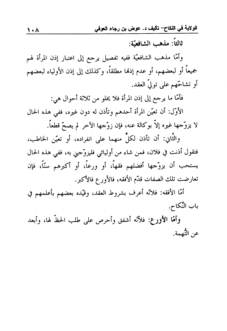 والثَّاني: أن تأذن لكلٍّ منهما على انفراده، أو تعيّن الخاطب، فتقول أذنت في فلان، فمن شاء من أوليائي فليزوّجني به، ففي هذه الحال يستحب أن يزوّجها أفضلهم فقهاً، أو ورعاً، أو أكبرهم سنّاً، فإن تعارضت تلك الصفات قدّم الأفقه، فالأورع فالأكبر.