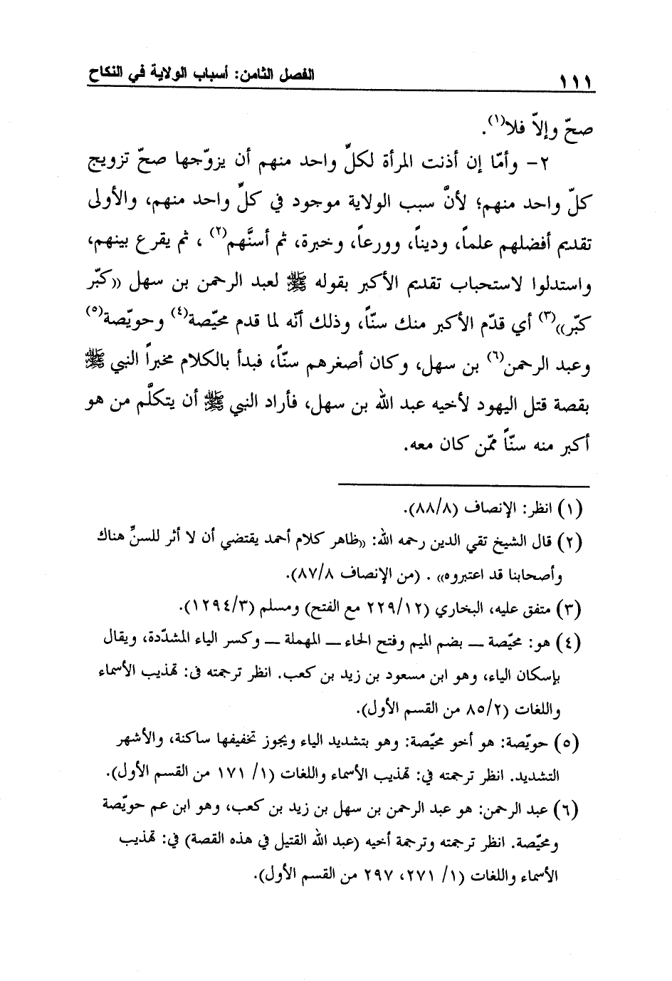 2- وأمّا إن أذنت المرأة لكلِّ واحد منهم أن يزوّجها صحّ تزويج كلّ واحد منهم؛ لأنَّ سبب الولاية موجود في كلِّ واحد منهم، والأولى تقديم أفضلهم علماً، وديناً، وورعاً، وخبرة، ثم أسنَّهم2، ثم يقرع بينهم، واستدلوا لاستحباب تقديم الأكبر بقوله صلى الله عليه وسلم لعبد الرحمن بن سهل "كبّر كبّر" 3 أي قدّم الأكبر منك سنّاً، وذلك أنّه لما قدم محيّصة4 وحويّصة5 وعبد الرحمن6 بن سهل، وكان أصغرهم سنّاً، فبدأ بالكلام مخبراً النبي صلى الله عليه وسلم بقصة قتل اليهود لأخيه عبد الله بن سهل، فأراد النبي صلى الله عليه وسلم أن يتكلَّم من هو أكبر منه سنّاً ممّن كان معه.