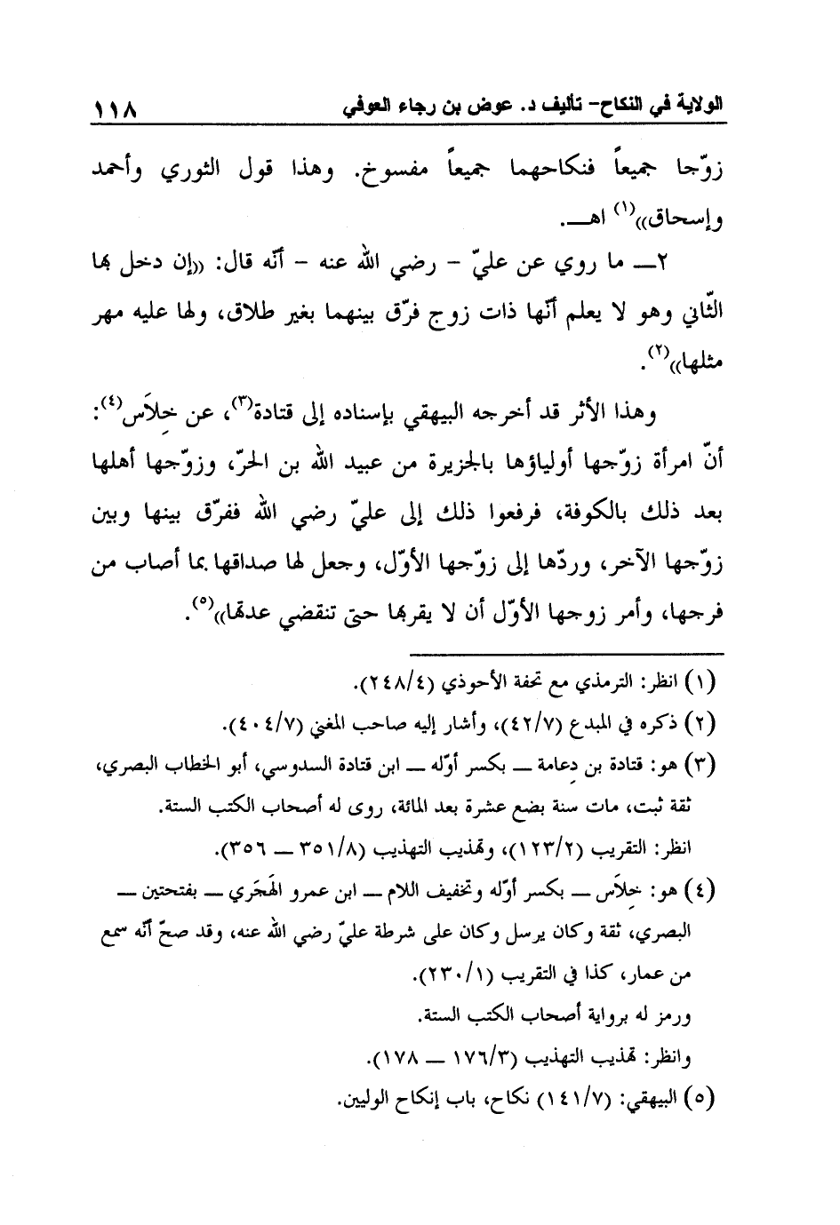 وهذا الأثر قد أخرجه البيهقي بإسناده إلى قتادة3، عن خِلاَس4: أنّ امرأة زوّجها أولياؤها بالجزيرة من عبيد الله بن الحرّ، وزوّجها أهلها بعد ذلك بالكوفة، فرفعوا ذلك إلى عليّ رضي الله ففرّق بينها وبين زوّجها الآخر، وردّها إلى زوّجها الأوّل، وجعل لها صداقها بما أصاب من فرجها، وأمر زوجها الأوّل أن لا يقربها حتى تنقضي عدتها"5.