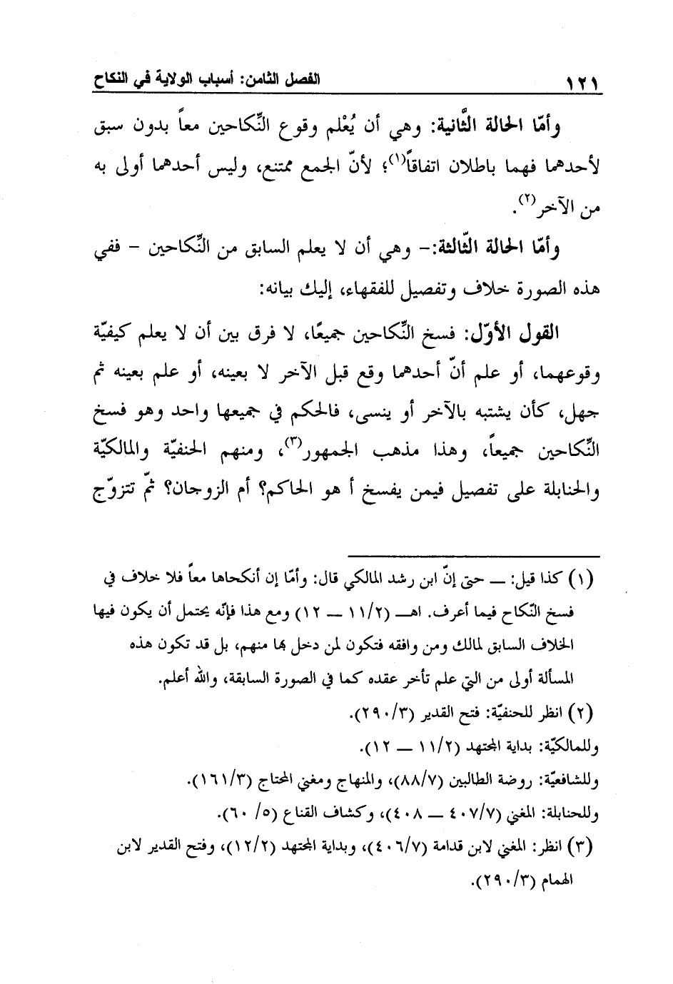 1 كذا قيل: ـ حتى إنّ ابن رشد المالكي قال: وأمّا إن أنكحاها معاً فلا خلاف في فسخ النّكاح فيما أعرف. اهـ (2/11 ـ 12) ومع هذا فإنّه يحتمل أن يكون فيها الخلاف السابق لمالك ومن وافقه فتكون لمن دخل بها منهم، بل قد تكون هذه المسألة أولى من التي علم تأخر عقده كما في الصورة السابقة، والله أعلم.