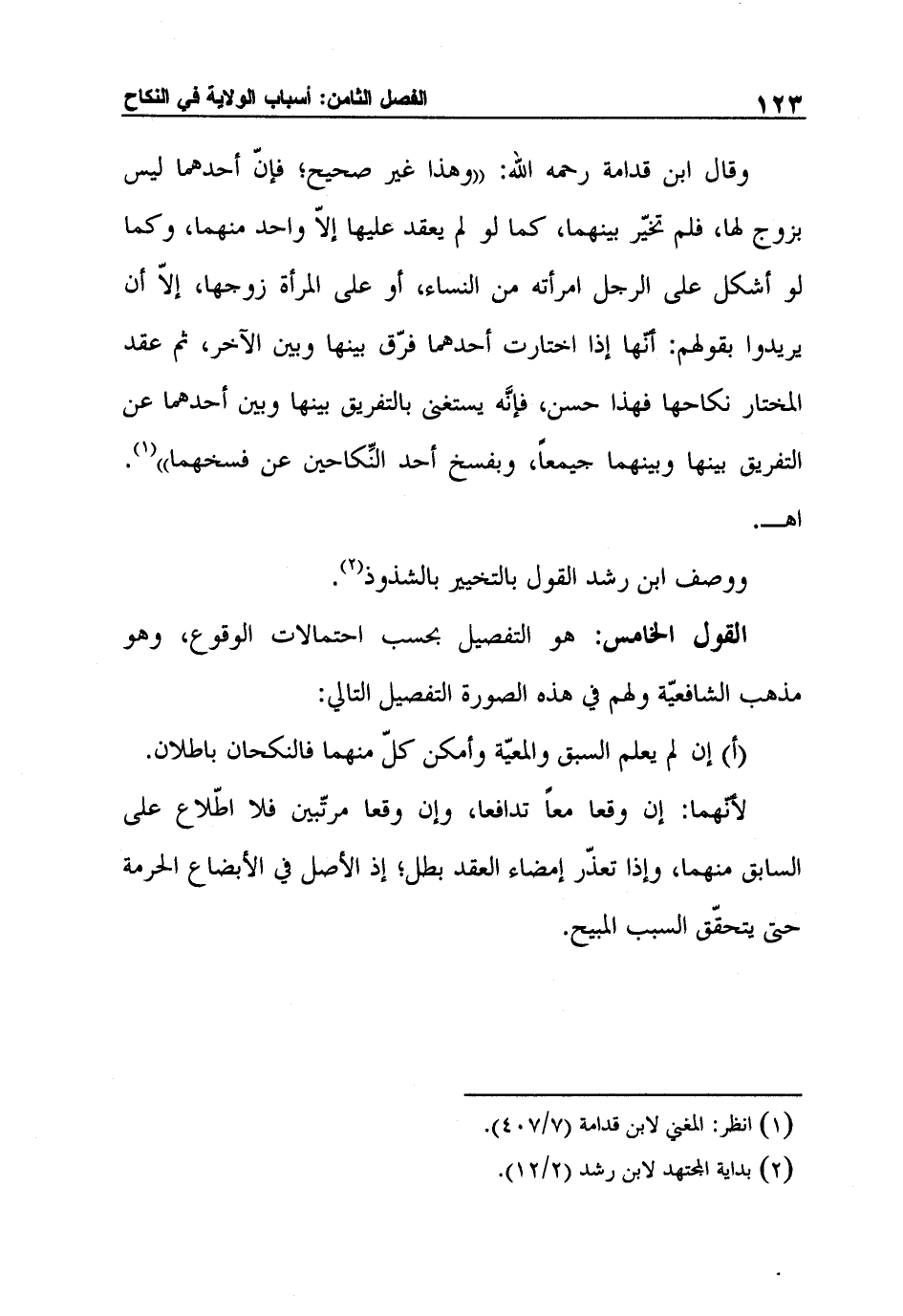 وقال ابن قدامة رحمه الله: "وهذا غير صحيح؛ فإنّ أحدهما ليس بزوج لها، فلم تخيّر بينهما، كما لو لم يعقد عليها إلاّ واحد منهما، وكما لو أشكل على الرجل امرأته من النساء، أو على المرأة زوجها، إلاّ أن يريدوا بقولهم: أنّها إذا اختارت أحدهما فرّق بينها وبين الآخر، ثم عقد المختار نكاحها فهذا حسن، فإنَّه يستغنى بالتفريق بينها وبين أحدهما عن التفريق بينها وبينهما جيمعاً، وبفسخ أحد النِّكاحين عن فسخهما"1. اهـ.