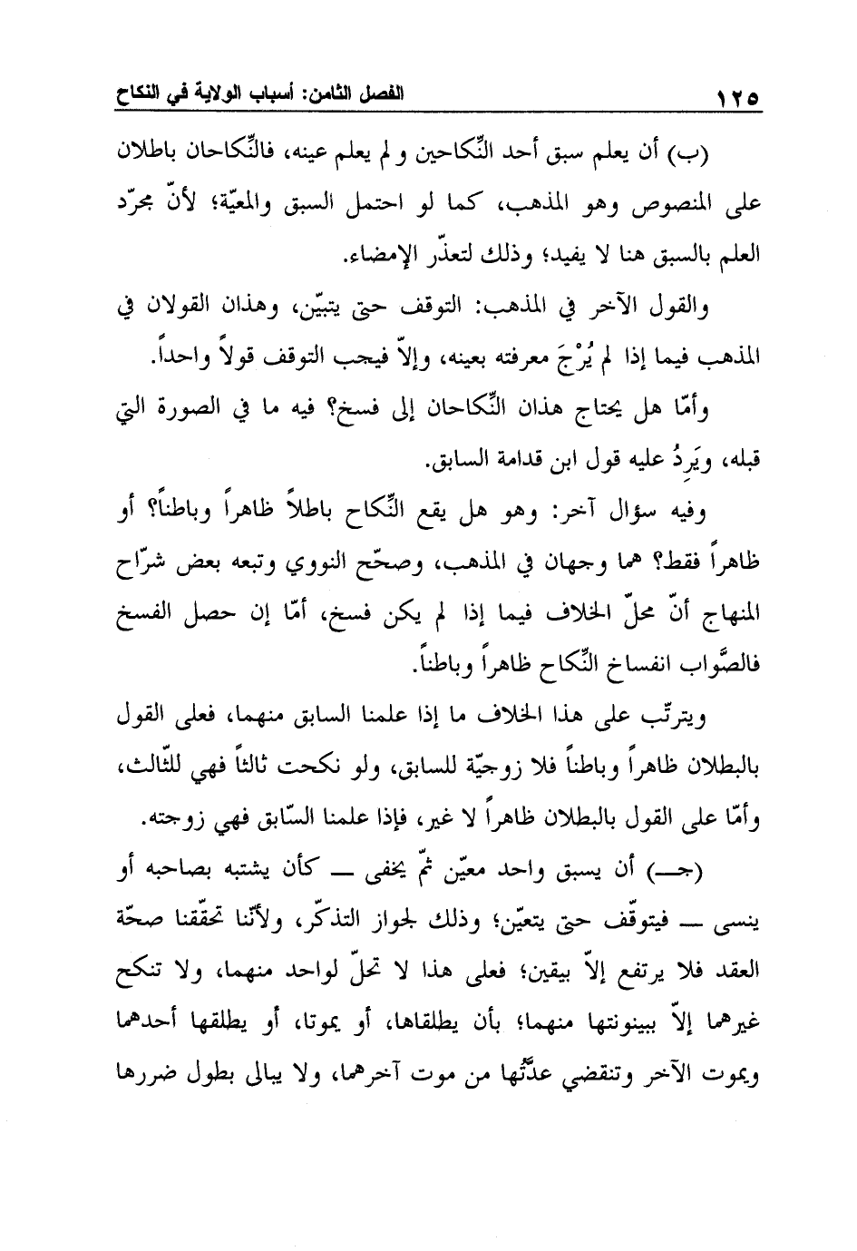 (ج) أن يسبق واحد معيّن ثمّ يخفى ـ كأن يشتبه بصاحبه أو ينسى ـ فيتوقّف حتى يتعيّن؛ وذلك لجواز التذكّر، ولأنّنا تحقّقنا صحّة العقد فلا يرتفع إلاّ بيقين؛ فعلى هذا لا تحلّ لواحد منهما، ولا تنكح غيرهما إلاّ ببينونتها منهما؛ بأن يطلقاها، أو يموتا، أو يطلقها أحدهما ويموت الآخر وتنقضي عدَّتُها من موت آخرهما، ولا يبالى بطول ضررها