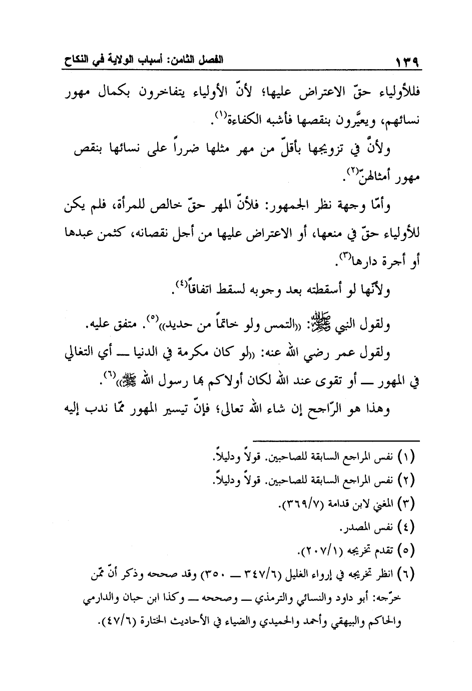 وأمّا وجهة نظر الجمهور: فلأنّ المهر حقّ خالص للمرأة، فلم يكن للأولياء حقّ في منعها، أو الاعتراض عليها من أجل نقصانه، كثمن عبدها أو أجرة دارها3.