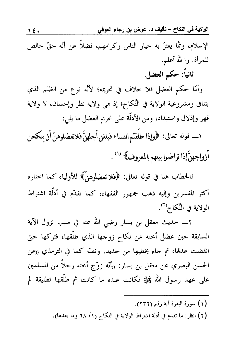 وأمّا حكم العضل فلا خلاف في تحريمه؛ لأنَّه نوع من الظلم الذي يتنافى ومشروعية الولاية في النِّكاح؛ إذ هي ولاية نظر وإحسان، لا ولاية قهر وإذلال واستبداد، ومن الأدلّة على تحريم العضل ما يلي: