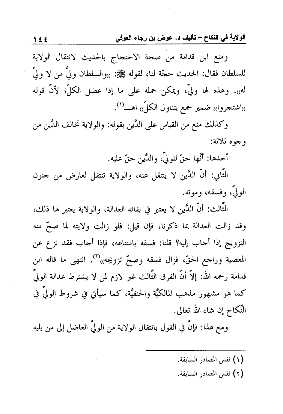 الثَّالث: أنّ الدَّين لا يعتبر في بقائه العدالة، والولاية يعتبر لها ذلك، وقد زالت العدالة بما ذكرنا، فإن قيل: فلو زالت ولايته لما صحّ منه التزويج إذا أجاب إليه؟ قلنا: فسقه بامتناعه، فإذا أجاب فقد نزع عن المعصية وراجع الحقّ، فزال فسقه وصحّ تزويجه"2. انتهى ما قاله ابن قدامة رحمه الله: إلاّ أنّ الفرق الثَّالث غير لازم لمن لا يشترط عدالة الوليِّ كما هو مشهور مذهب المالكيَّة والحنفيَّة، كما سيأتي في شروط الوليِّ في النِّكاح إن شاء الله تعالى.
