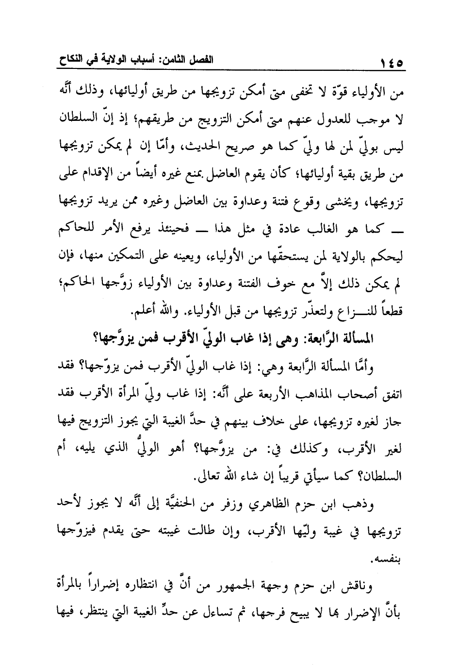 وذهب ابن حزم الظاهري وزفر من الحنفيَّة إلى أنَّه لا يجوز لأحد تزويجها في غيبة وليّها الأقرب، وإن طالت غيبته حتى يقدم فيزوّجها بنفسه.