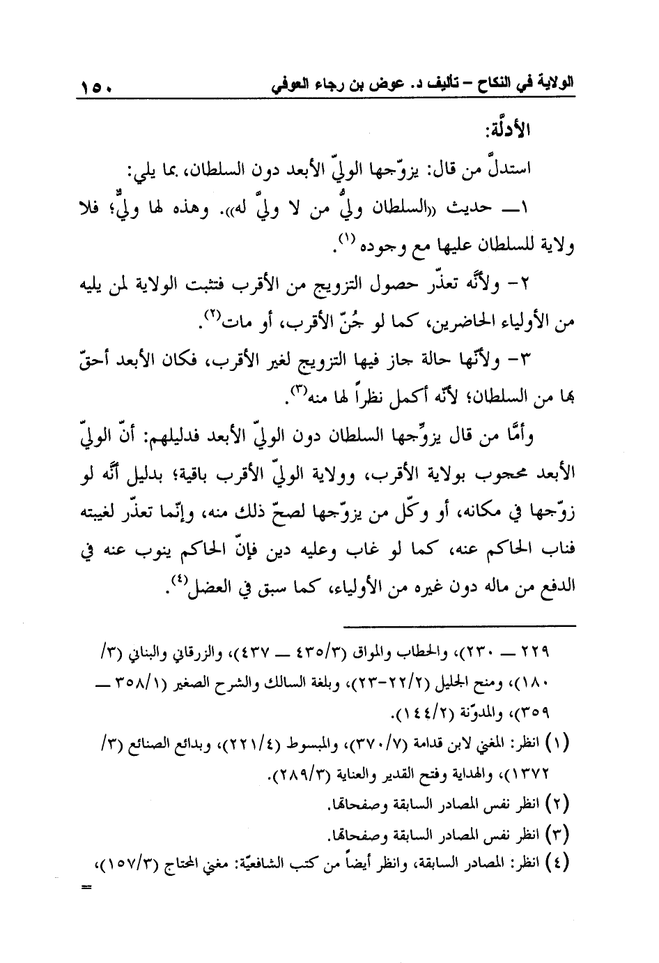 وأمَّا من قال يزوِّجها السلطان دون الوليّ الأبعد فدليلهم: أنّ الوليّ الأبعد محجوب بولاية الأقرب، وولاية الوليّ الأقرب باقية؛ بدليل أنَّه لو زوّجها في مكانه، أو وكّل من يزوّجها لصحّ ذلك منه، وإنّما تعذّر لغيبته فناب الحاكم عنه، كما لو غاب وعليه دين فإنّ الحاكم ينوب عنه في الدفع من ماله دون غيره من الأولياء، كما سبق في العضل4.