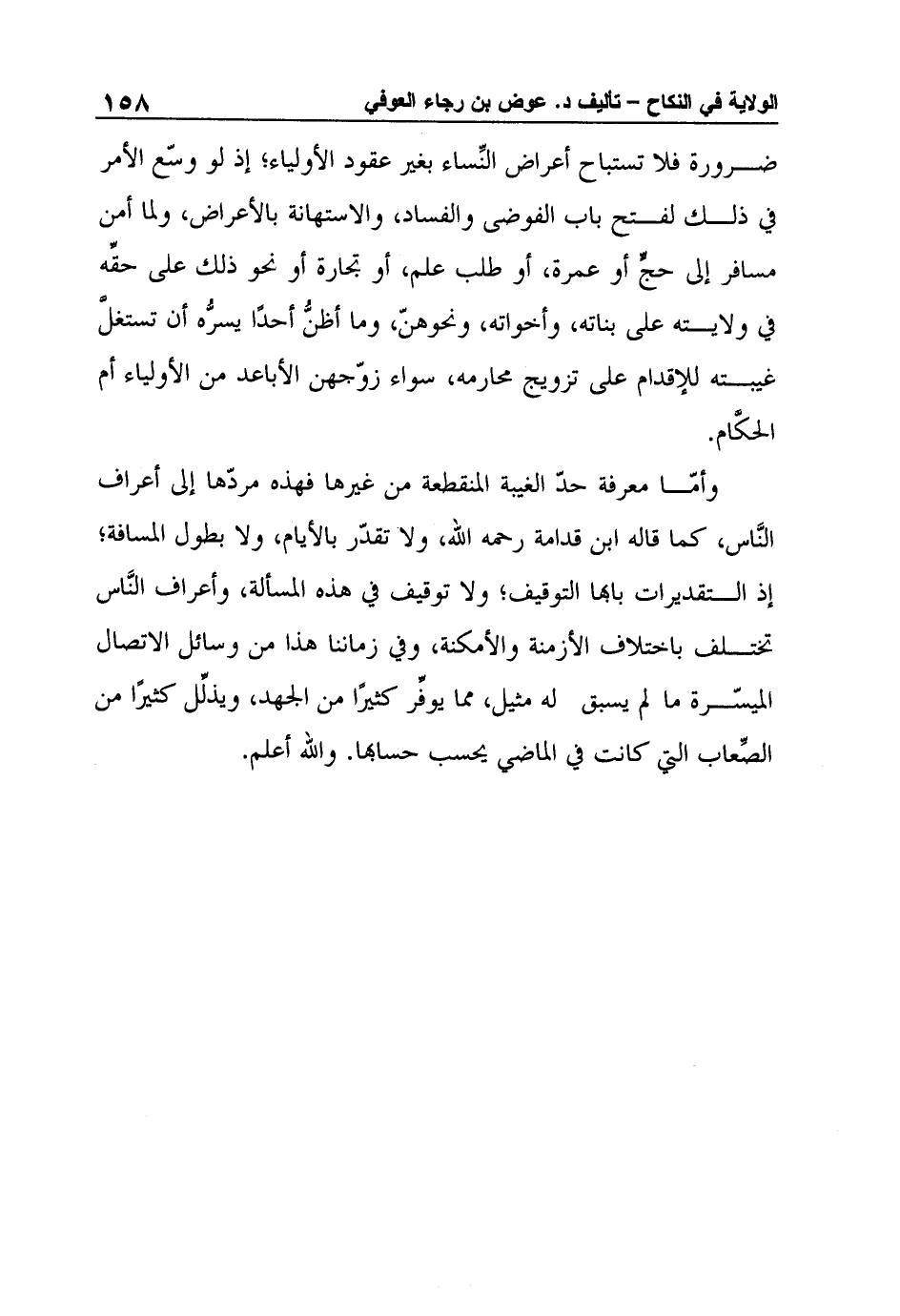 ضرورة فلا تستباح أعراض النِّساء بغير عقود الأولياء؛ إذ لو وسّع الأمر في ذلك لفتح باب الفوضى والفساد، والاستهانة بالأعراض، ولما أمن مسافر إلى حجٍّ أو عمرة، أو طلب علم، أو تجارة أو نحو ذلك على حقِّه في ولايته على بناته، وأخواته، ونحوهنّ، وما أظنُّ أحدًا يسرُّه أن تستغلَّ غيبته للإقدام على تزويج محارمه، سواء زوّجهن الأباعد من الأولياء أم الحكَّام.