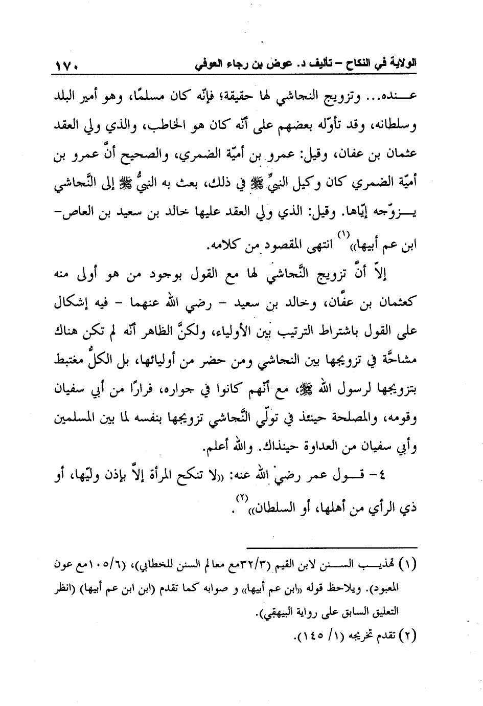 4- قول عمر رضي الله عنه: "لا تنكح المرأة إلاَّ بإذن وليّها، أو ذي الرأي من أهلها، أو السلطان "2.