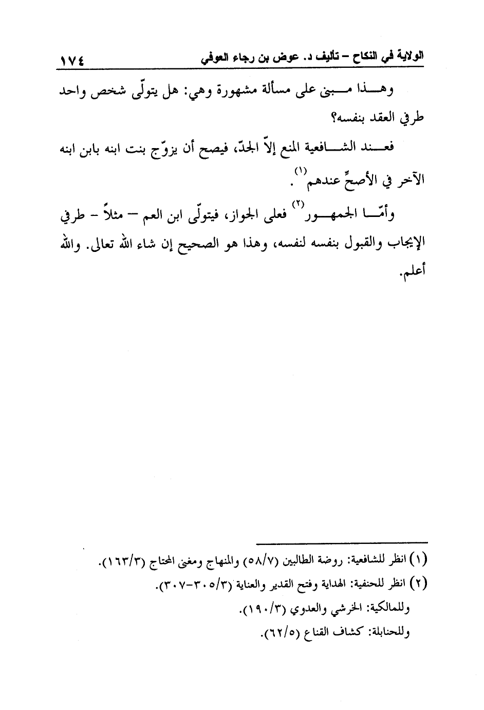 وأمّا الجمهور2 فعلى الجواز، فيتولّى ابن العم – مثلاً - طرفي الإيجاب والقبول بنفسه لنفسه، وهذا هو الصحيح إن شاء الله تعالى. والله أعلم.