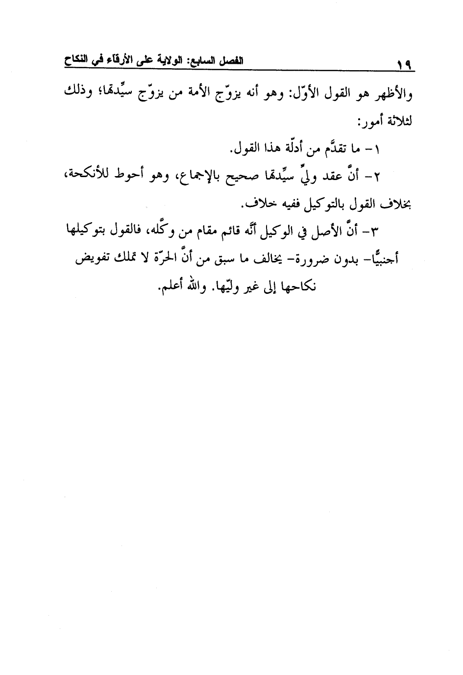 3- أنَّ الأصل في الوكيل أنَّه قائم مقام من وكَّله، فالقول بتوكيلها أجنبيًّا- بدون ضرورة- يخالف ما سبق من أنَّ الحرّة لا تملك تفويض نكاحها إلى غير وليّها. والله أعلم.