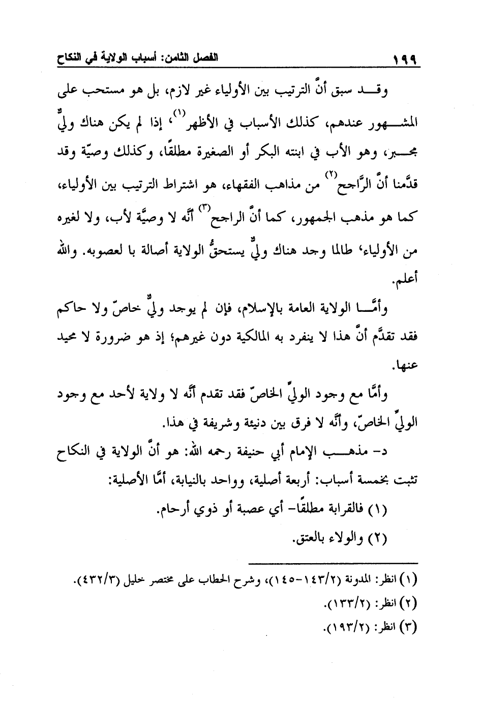 وقد سبق أنَّ الترتيب بين الأولياء غير لازم، بل هو مستحب على المشهور عندهم، كذلك الأسباب في الأظهر1، إذا لم يكن هناك وليٌّ مجبر، وهو الأب في ابنته البكر أو الصغيرة مطلقًا، وكذلك وصيّة وقد قدَّمنا أنَّ الرَّاجح2 من مذاهب الفقهاء، هو اشتراط الترتيب بين الأولياء، كما هو مذهب الجمهور، كما أنَّ الراجح3 أنَّه لا وصيَّة لأب، ولا لغيره من الأولياء، طالما وجد هناك وليٌّ يستحقُّ الولاية أصالة با لعصوبه. والله أعلم.
