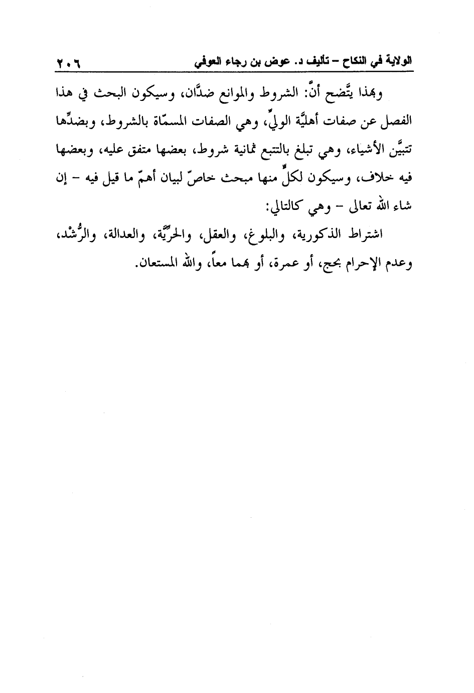 وبهذا يتَّضح أنَّ: الشروط والموانع ضدَّان، وسيكون البحث في هذا الفصل عن صفات أهليَّة الوليِّ، وهي الصفات المسمّاة بالشروط، وبضدِّها تتبيَّن الأشياء، وهي تبلغ بالتتبع ثمانية شروط، بعضها متفق عليه، وبعضها فيه خلاف، وسيكون لكلٍّ منها مبحث خاصّ لبيان أهمّ ما قيل فيه - إن شاء الله تعالى - وهي كالتالي: