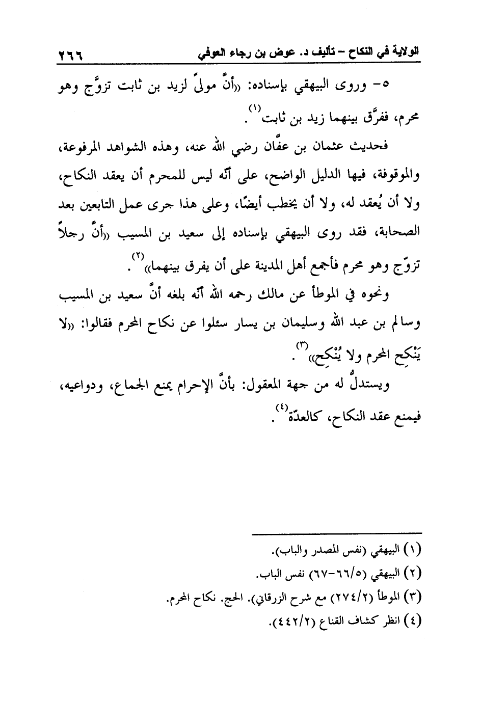 فحديث عثمان بن عفَّان رضي الله عنه، وهذه الشواهد المرفوعة، والموقوفة، فيها الدليل الواضح، على أنّه ليس للمحرم أن يعقد النكاح، ولا أن يُعقد له، ولا أن يخطب أيضًا، وعلى هذا جرى عمل التابعين بعد الصحابة، فقد روى البيهقي بإسناده إلى سعيد بن المسيب "أنَّ رجلاً تزوّج وهو محرم فأجمع أهل المدينة على أن يفرق بينهما"2.