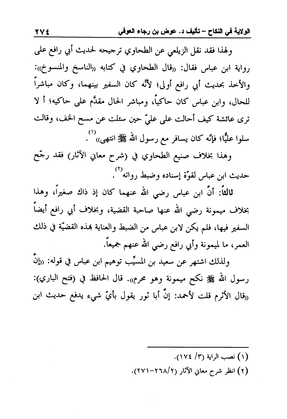 ولهذا فقد نقل الزيلعي عن الطحاوي ترجيحه لحديث أبي رافع على رواية ابن عباس فقال: "قال الطحاوي في كتابه "الناسخ والمنسوخ": والأخذ بحديث أبي رافع أولى؛ لأنَّه كان السفير بينهما، وكان مباشراً للحال، وابن عباس كان حاكياً، ومباشر الحال مقدَّم على حاكيه؛ ألا ترى عائشة كيف أحالت على عليّ حين سئلت عن مسح الخف، وقالت سلوا عليًّا؛ فإنّه كان يسافر مع رسول الله صلى الله عليه وسلم انتهى"1.