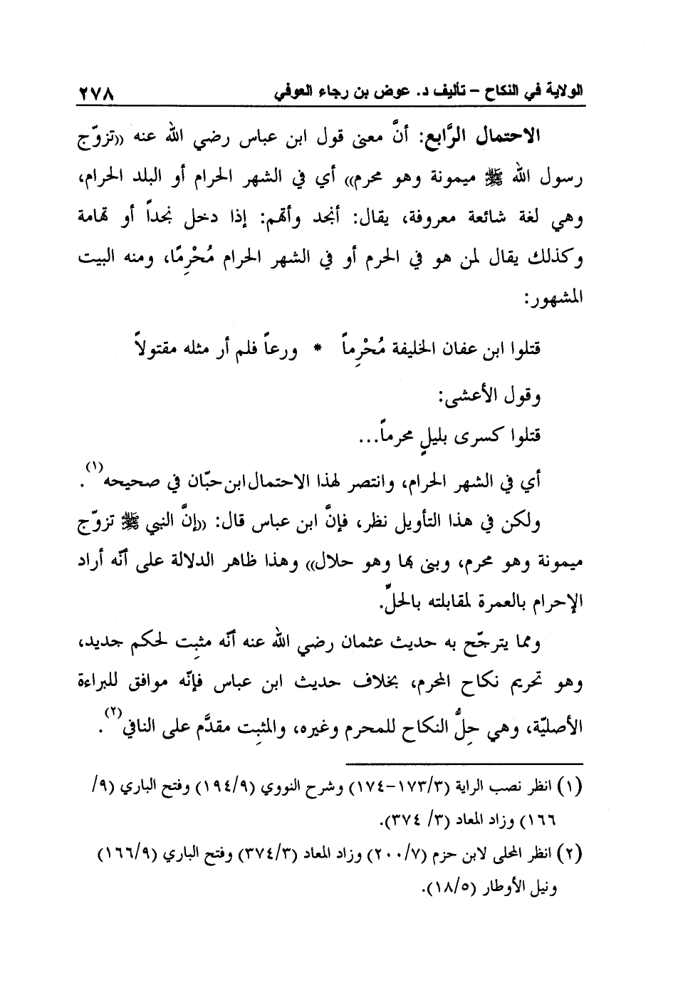 ولكن في هذا التأويل نظر، فإنَّ ابن عباس قال: "إنَّ النبي صلى الله عليه وسلم تزوّج ميمونة وهو محرم، وبنى بها وهو حلال" وهذا ظاهر الدلالة على أنّه أراد الإحرام بالعمرة لمقابلته بالحلِّ.