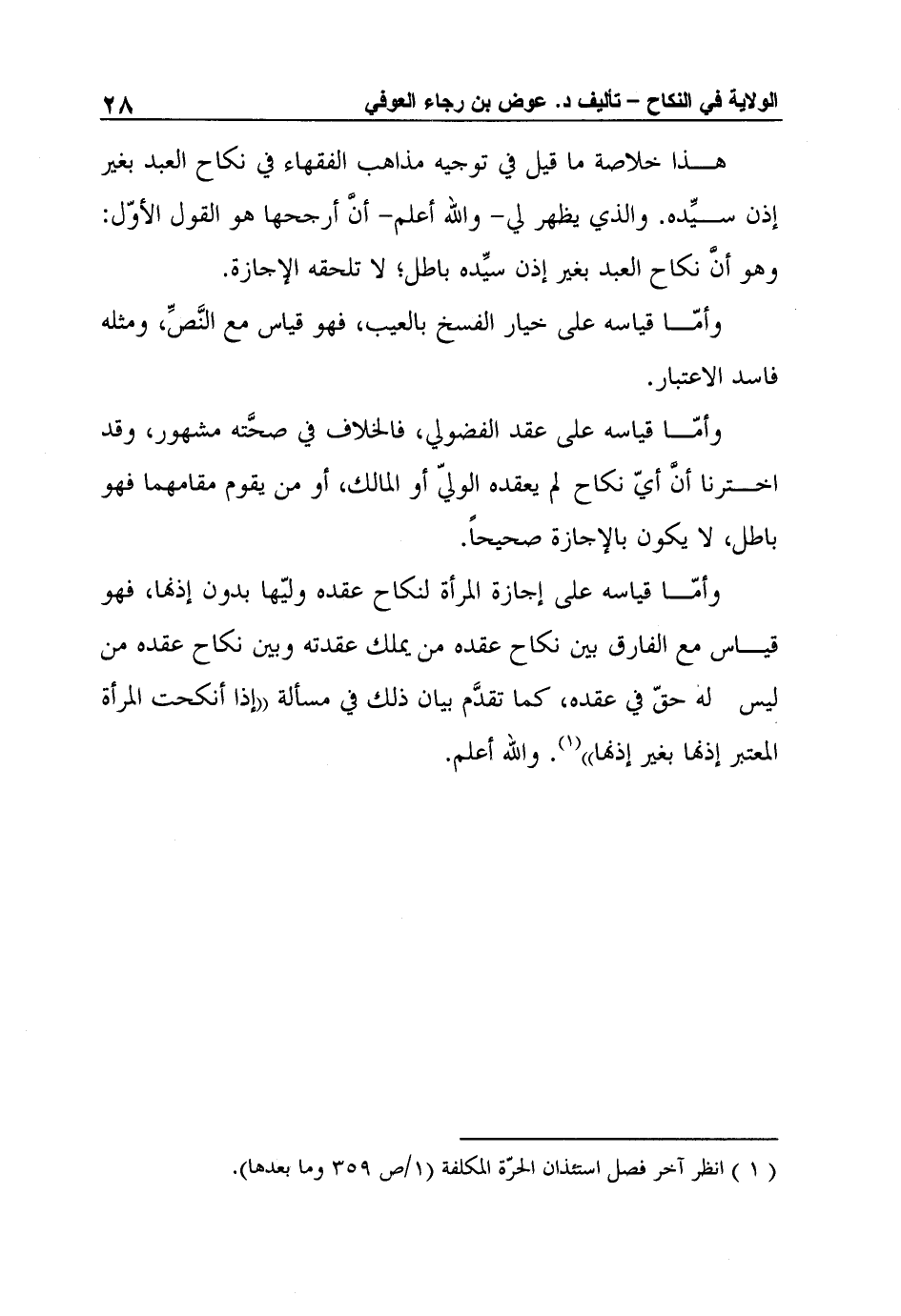 هذا خلاصة ما قيل في توجيه مذاهب الفقهاء في نكاح العبد بغير إذن سيِّده. والذي يظهر لي- والله أعلم- أنَّ أرجحها هو القول الأوّل: وهو أنََّّ نكاح العبد بغير إذن سيِّده باطل؛ لا تلحقه الإجازة.