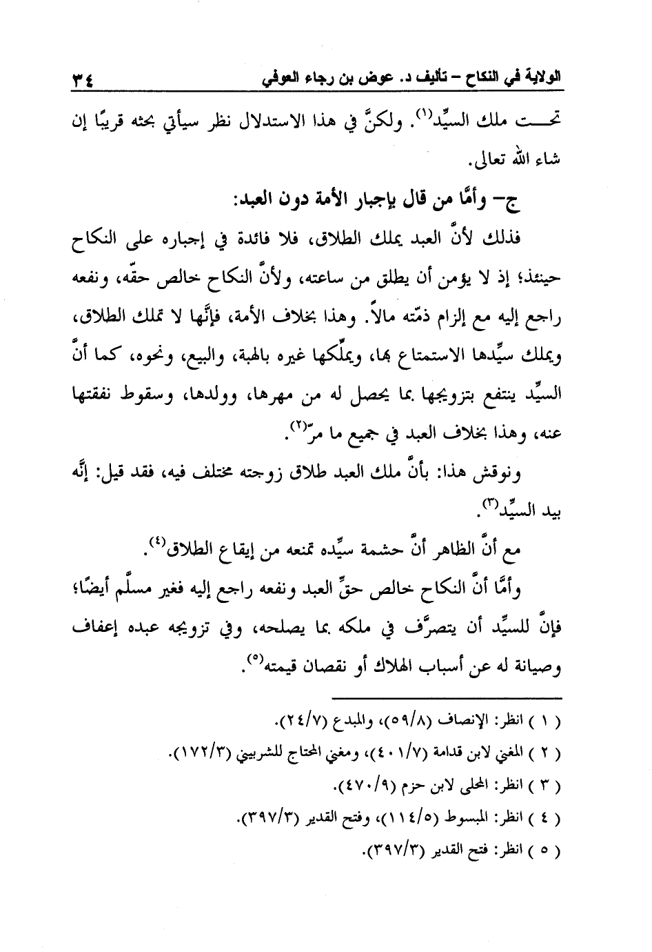 وأمَّا أنَّ النكاح خالص حقِّ العبد ونفعه راجع إليه فغير مسلَّم أيضًا؛ فإنَّ للسيِّد أن يتصرَّف في ملكه بما يصلحه، وفي تزويجه عبده إعفاف وصيانة له عن أسباب الهلاك أو نقصان قيمته5.
