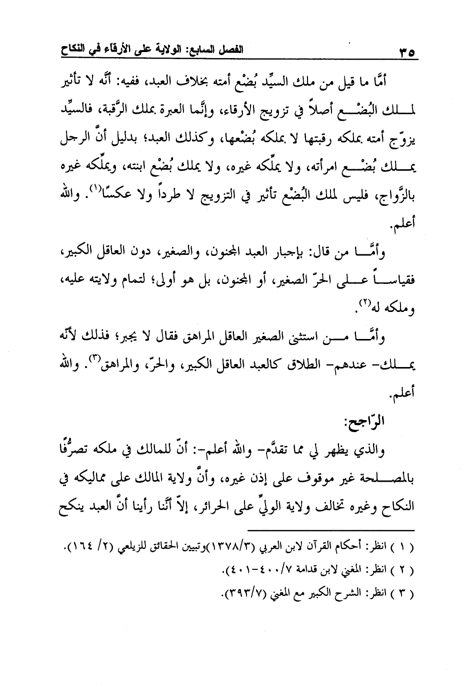 والذي يظهر لي مما تقدَّم- والله أعلم-: أنّ للمالك في ملكه تصرُّفًا بالمصلحة غير موقوف على إذن غيره، وأنَّ ولاية المالك على مماليكه في النكاح وغيره تخالف ولاية الوليِّ على الحرائر، إلاّ أنَّنا رأينا أنَّ العبد ينكح