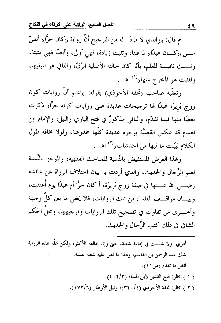 وبهذا العرض المستفيض بالنِّسبة للمباحث الفقهية، والموجز بالنِّسبة لعلم الرِّجال والحديث، والذي أردت به بيان اختلاف الرواة عن عائشة رضي الله عنها في صفة زوج بَرِيرَة، أكان حرًّا أم عبدًا يوم أُعتقت، وبيان مواقف العلماء من تلك الروايات، فلا يخفى ما بين كلِّ وجهة وأخرى من تفاوت في تصحيح تلك الروايات وتوجيهها، ومحلُّ الحكم الشافي في ذلك كتب الرِّجال والحديث.