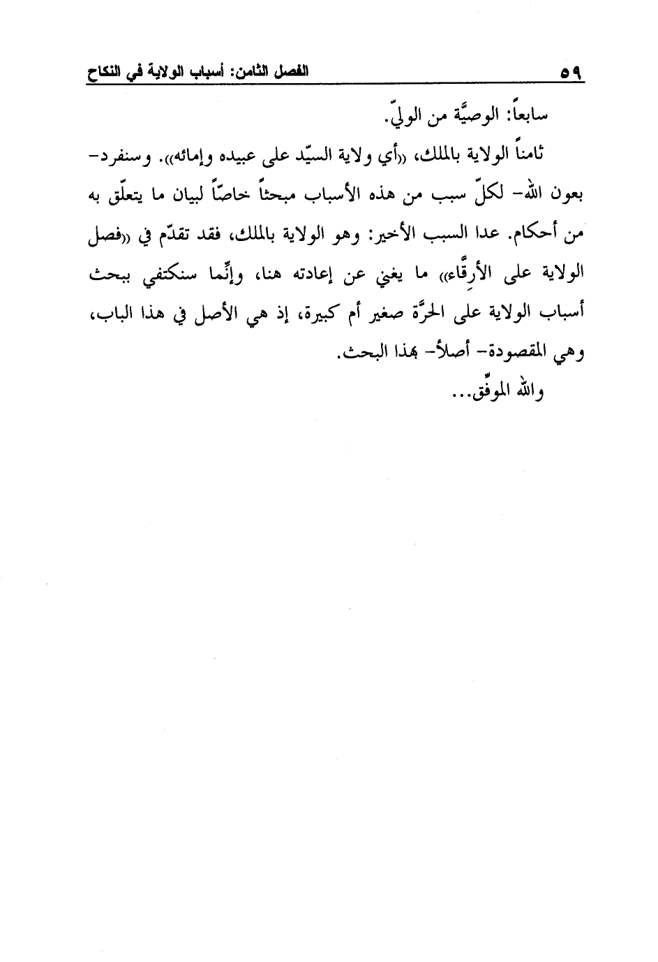 ثامناً الولاية بالملك، أي ولاية السيّد على عبيده وإمائه. وسنفرد- بعون الله- لكلّ سبب من هذه الأسباب مبحثاً خاصّاً لبيان ما يتعلّق به من أحكام. عدا السبب الأخير: وهو الولاية بالملك، فقد تقدّم في فصل الولاية على الأرِقَّاء ما يغني عن إعادته هنا، وإنِّما سنكتفي ببحث أسباب الولاية على الحرَّة صغير أم كبيرة، إذ هي الأصل في هذا الباب، وهي المقصودة- أصلأ- بهذا البحث، والله الموفِّق.