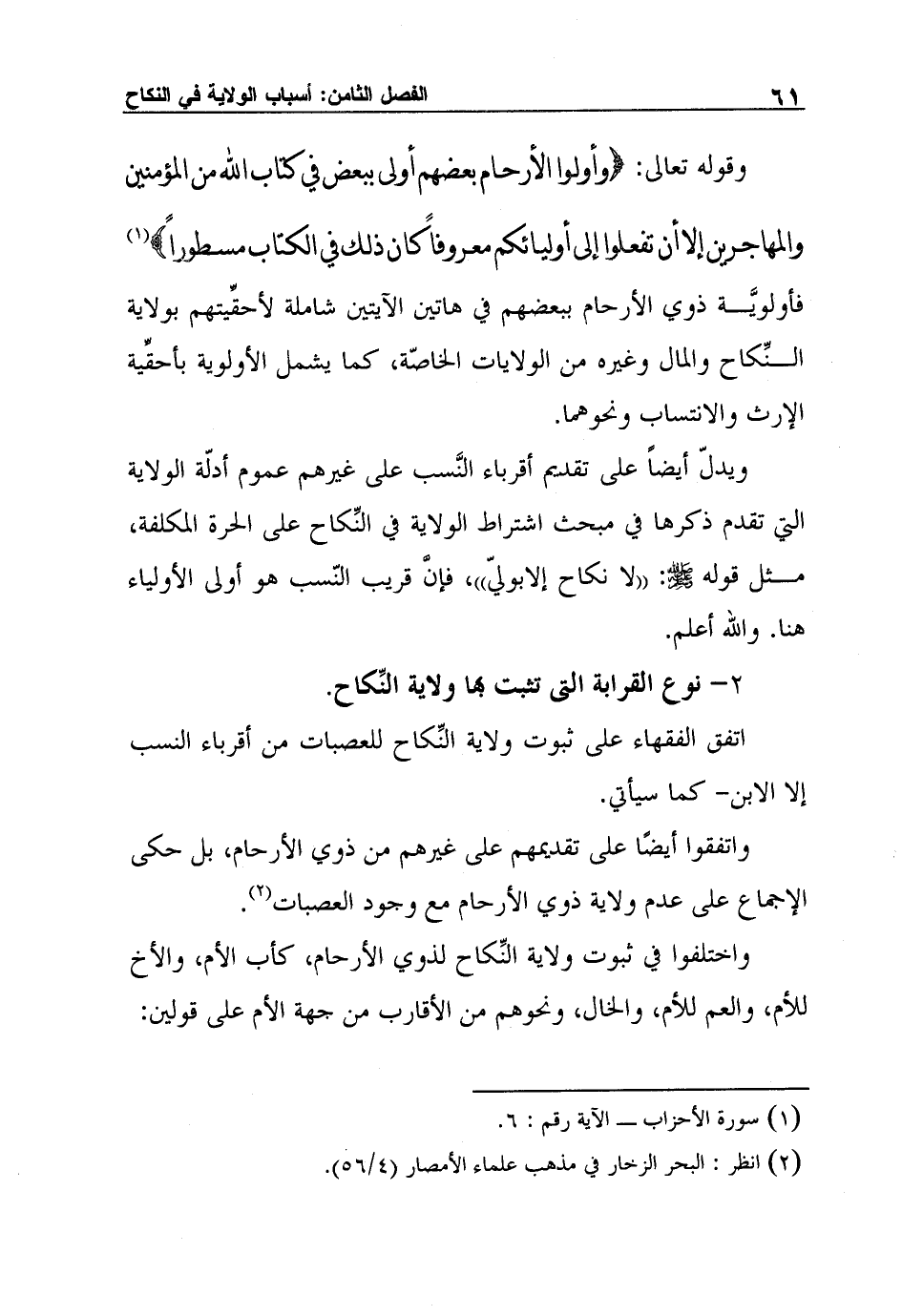 وقوله تعالى: {وَأُولُو الأَرْحَامِ بَعْضُهُمْ أَوْلَى بِبَعْضٍ فِي كِتَابِ اللَّهِ مِنَ الْمُؤْمِنِينَ وَالْمُهَاجِرِينَ إِلاّ أَنْ تَفْعَلُوا إِلَى أَوْلِيَائِكُمْ مَعْرُوفاً كَانَ ذَلِكَ فِي الْكِتَابِ مَسْطُوراً} 1 فأولويَّة ذوي الأرحام ببعضهم في هاتين الآيتين شاملة لأحقِّيتهم بولاية النِّكاح والمال وغيره من الولايات الخاصّة، كما يشمل الأولوية بأحقِّية الإرث والانتساب ونحوهما.