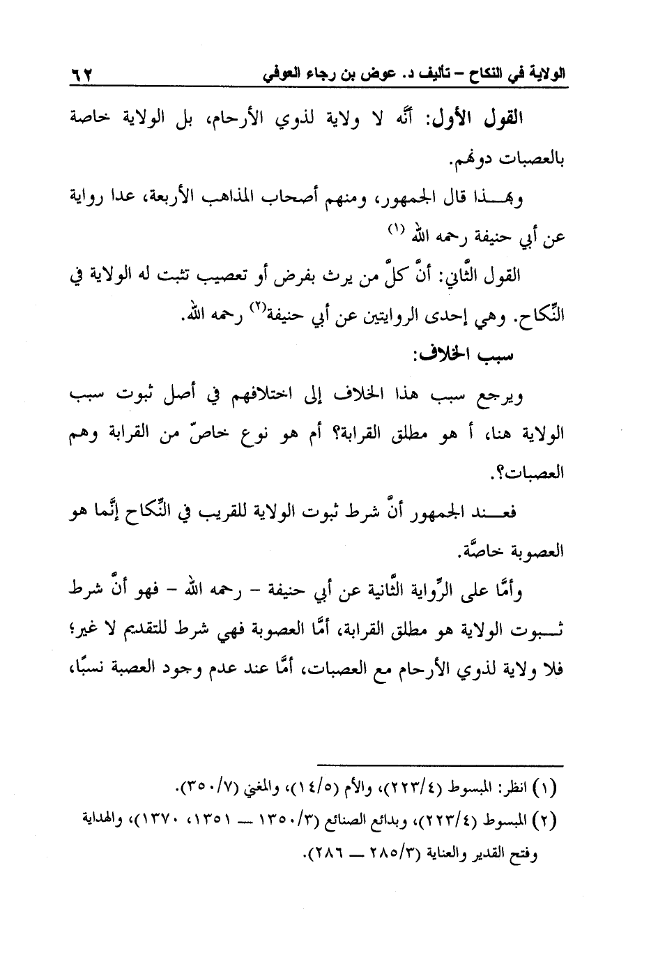 فعند الجمهور أنَّ شرط ثبوت الولاية للقريب في النِّكاح إنَّما هو العصوبة خاصَّة.