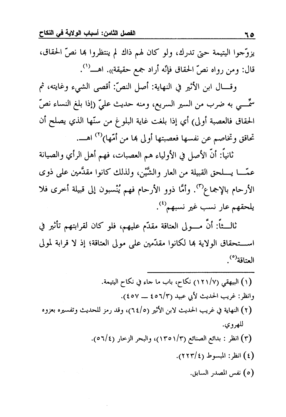 وقال ابن الأثير في النهاية: أصل النصّ: أقصى الشيء وغايته، ثم سمِّي به ضرب من السير السريع، ومنه حديث عليّ "إذا بلغ النساء نصّ الحقاق فالعصبة أولى" أي إذا بلغت غاية البلوغ من سنّها الذي يصلح أن تحاقق وتخاصم عن نفسها فعصبتها أولى بها من أمّها) 2 اهـ.