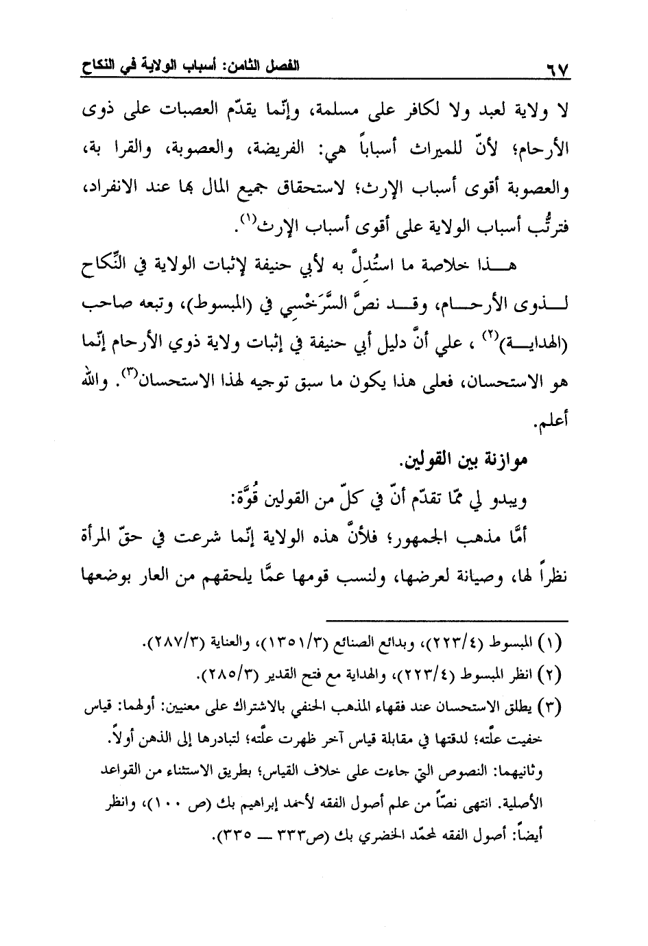 هذا خلاصة ما استُدِلَّ به لأبي حنيفة لإثبات الولاية في النِّكاح لذوى الأرحام، وقد نصَّ السَّرَخْسِي في (المبسوط) ، وتبعه صاحب (الهداية) 2، علي أنَّ دليل أبي حنيفة في إثبات ولاية ذوي الأرحام إنّما هو الاستحسان، فعلى هذا يكون ما سبق توجيه لهذا الاستحسان3. والله أعلم.
