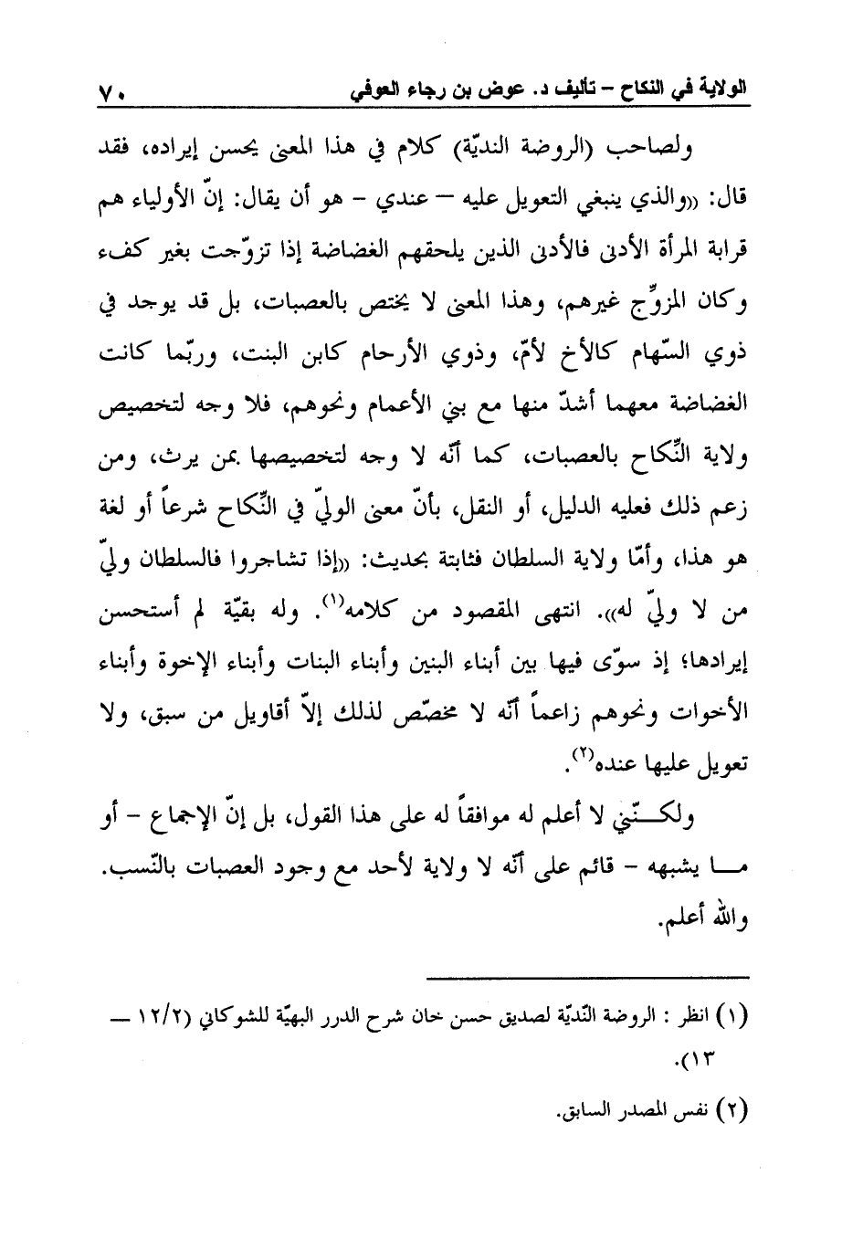 ولصاحب (الروضة النديّة) كلام في هذا المعنى يحسن إيراده، فقد قال: "والذي ينبغي التعويل عليه – عندي - هو أن يقال: إنّ الأولياء هم قرابة المرأة الأدنى فالأدنى الذين يلحقهم الغضاضة إذا تزوّجت بغير كفء وكان المزوِّج غيرهم، وهذا المعنى لا يختص بالعصبات، بل قد يوجد في ذوي السّهام كالأخ لأمّ، وذوي الأرحام كابن البنت، وربّما كانت الغضاضة معهما أشدّ منها مع بني الأعمام ونحوهم، فلا وجه لتخصيص ولاية النِّكاح بالعصبات، كما أنّه لا وجه لتخصيصها بمن يرث، ومن زعم ذلك فعليه الدليل، أو النقل، بأنّ معنى الوليّ في النِّكاح شرعاً أو لغة هو هذا، وأمّا ولاية السلطان فثابتة بحديث: "إذا تشاجروا فالسلطان وليّ من لا وليّ له". انتهى المقصود من كلامه1. وله بقيّة لم أستحسن إيرادها؛ إذ سوّى فيها بين أبناء البنين وأبناء البنات وأبناء الإخوة وأبناء الأخوات ونحوهم زاعماً أنّه لا مخصّص لذلك إلاّ أقاويل من سبق، ولا تعويل عليها عنده2.