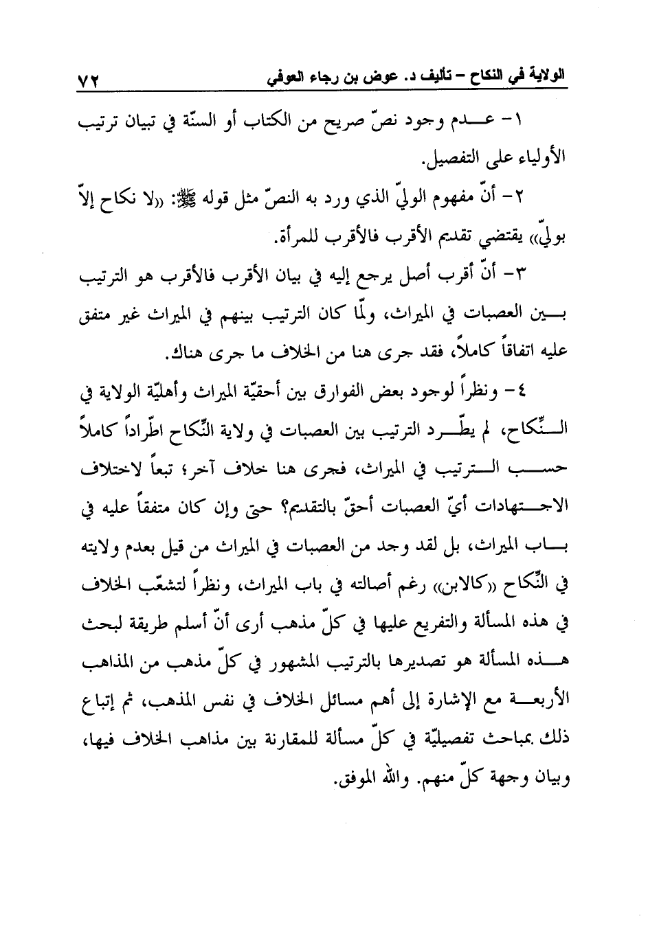 4- ونظراً لوجود بعض الفوارق بين أحقيّة الميراث وأهليّة الولاية في النِّكاح، لم يطّرد الترتيب بين العصبات في ولاية النِّكاح اطّراداً كاملاً حسب الترتيب في الميراث، فجرى هنا خلاف آخر؛ تبعاً لاختلاف الاجتهادات أيّ العصبات أحقّ بالتقديم؟ حتى وإن كان متفقاً عليه في باب الميراث، بل لقد وجد من العصبات في الميراث من قيل بعدم ولايته في النِّكاح "كالابن" رغم أصالته في باب الميراث، ونظراً لتشعّب الخلاف في هذه المسألة والتفريع عليها في كلّ مذهب أرى أنّ أسلم طريقة لبحث هذه المسألة هو تصديرها بالترتيب المشهور في كلّ مذهب من المذاهب الأربعة مع الإشارة إلى أهم مسائل الخلاف في نفس المذهب، ثم إتباع ذلك بمباحث تفصيليّة في كلّ مسألة للمقارنة بين مذاهب الخلاف فيها، وبيان وجهة كلّ منهم. والله الموفق.