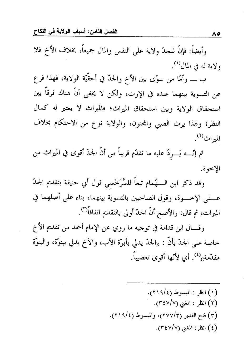وقال ابن قدامة في توجيه ما روي عن الإمام أحمد من تقديم الأخ خاصة على الجدّ بأنّ: "الجدّ يدلي بأبوّة الأب، والأخ يدلي ببنوّة، والبنوّة مقدّمة"4. أي لأنّها أقوى تعصيباً.