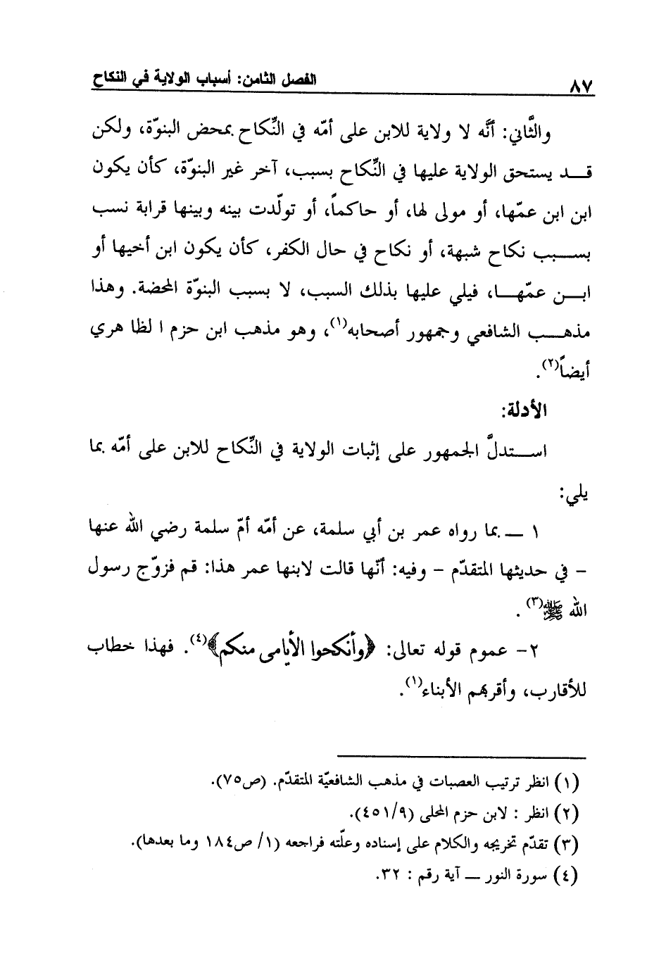 استدلَّ الجمهور على إثبات الولاية في النِّكاح للابن على أمّه بما يلي: