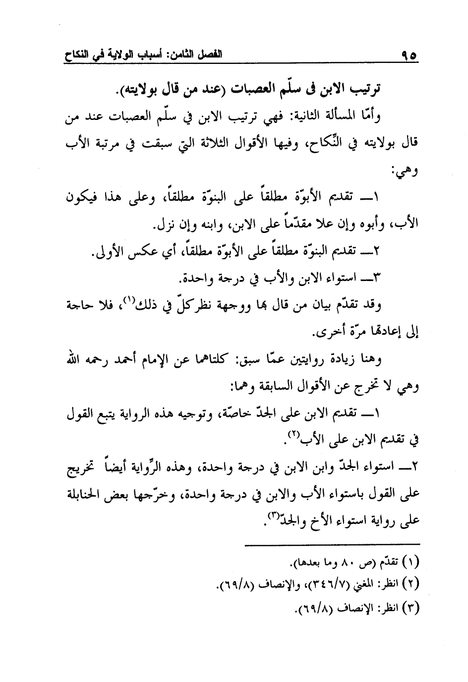وأمّا المسألة الثانية: فهي ترتيب الابن في سلّم العصبات عند من قال بولايته في النِّكاح، وفيها الأقوال الثلاثة التي سبقت في مرتبة الأب وهي: