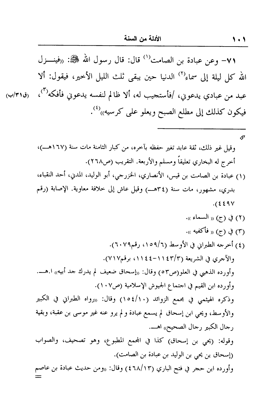 71- وعن عبادة بن الصامت1 قال: قال رسول الله صلى الله عليه وسلم: "فينزل الله كل ليلة إلى سماء2 الدنيا حين يبقى ثلث الليل الأخير، فيقول: ألا عبد من عبادي يدعوني، (ق31/ب) فأستجيب له، ألا ظالم لنفسه يدعوني فأفكه3، فيكون كذلك إلى مطلع الصبح ويعلو على كرسيه"4.