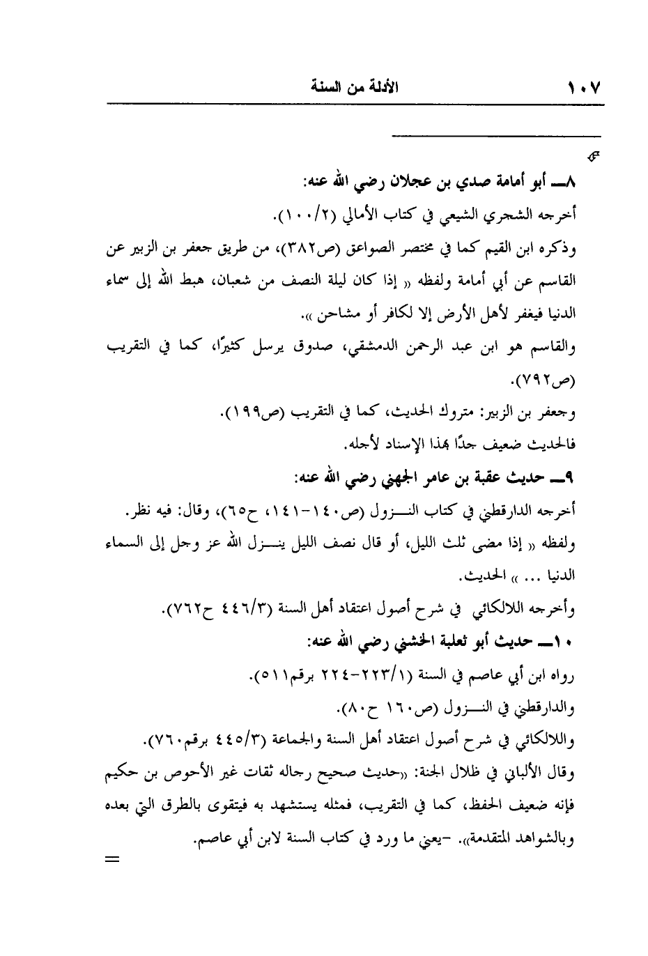 رواه ابن أبي عاصم في السنة (1/223-224 برقم511) .والدارقطني في النزول (ص160 ح80) .واللالكائي في شرح أصول اعتقاد أهل السنة والجماعة (3/445 برقم760) .وقال الألباني في ظلال الجنة: "حديث صحيح رجاله ثقات غير الأحوص بن حكيم فإنه ضعيف الحفظ، كما في التقريب، فمثله يستشهد به فيتقوى بالطرق التي بعده وبالشواهد المتقدمة". -يعني ما ورد في كتاب السنة لابن أبي عاصم.