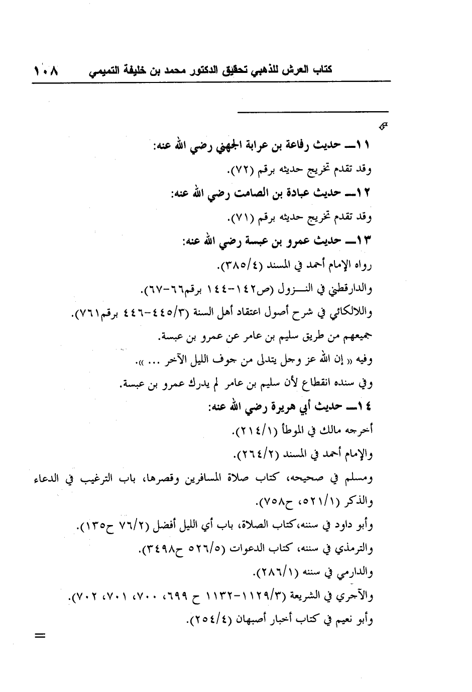 رواه الإمام أحمد في المسند (4/385) .والدارقطني في النزول (ص142-144 برقم66-67) .واللالكائي في شرح أصول اعتقاد أهل السنة (3/445-446 برقم761) .جميعهم من طريق سليم بن عامر عن عمرو بن عبسة. وفيه "إن الله عز وجل يتدلى من جوف الليل الآخر ... ".وفي سنده انقطاع لأن سليم بن عامر لم يدرك عمرو بن عبسة.