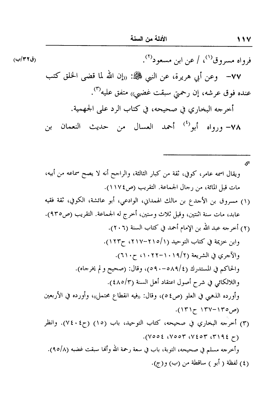 77- وعن أبي هريرة، عن النبي صلى الله عليه وسلم: "إن الله لما قضى الخلق كتب عنده فوق عرشه، إن رحمتي سبقت غضبي" متفق عليه3.