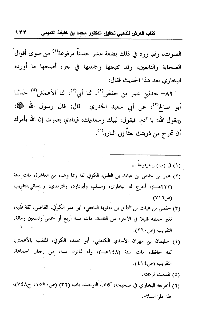 82- حدثني عمر بن حفص2، ثنا أبي3، ثنا الأعمش4 حدثناأبو صالح5، عن أبي سعيد الخدري قال: قال رسول الله صلى الله عليه وسلم: "يقول الله: يا آدم. فيقول: لبيك وسعديك، فينادي بصوت إن الله يأمرك أن تخرج من ذريتك بعثاً إلى النار"6.