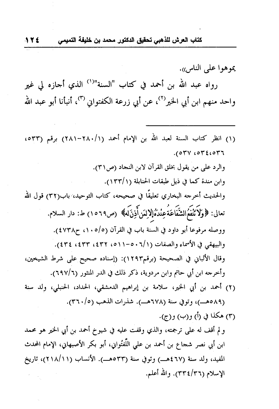 رواه عبد الله بن أحمد في كتاب "السنة"1 الذي أجازه لي غير واحد منهم ابن أبي الخير2، عن أبي زرعة الكفتواني 3، أنبأنا أبو عبد الله