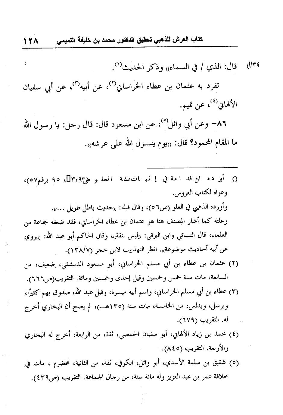 86- وعن أبي وائل5، عن ابن مسعود قال: قال رجل: يا رسول الله ما المقام المحمود؟ قال: "يوم ينزل الله على عرشه".