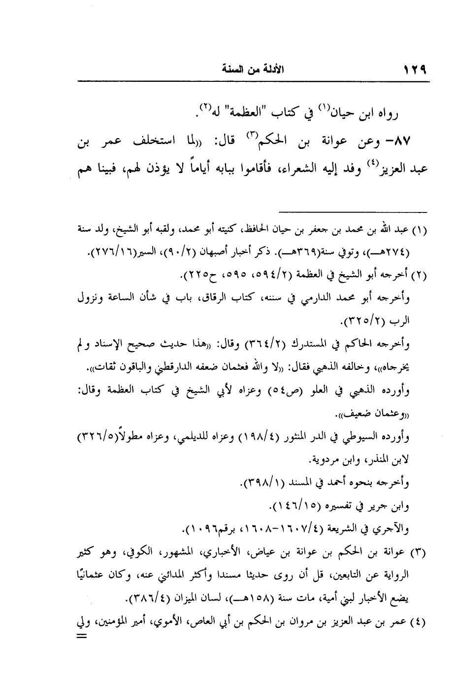 1 عبد الله بن محمد بن جعفر بن حيان الحافظ، كنيته أبو محمد، ولقبه أبو الشيخ، ولد سنة (274هـ) ، وتوفي سنة (369هـ) . ذكر أخبار أصبهان (2/90) ، السير (16/276) .