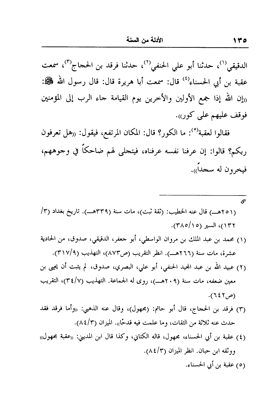 الدقيقي1، حدثنا أبو علي الحنفي2، حدثنا فرقد بن الحجاج3، سمعت عقبة بن أبي الحسناء4 قال: سمعت أبا هريرة قال: قال رسول الله صلى الله عليه وسلم: "إن الله إذا جمع الأولين والأخرين يوم القيامة جاء الرب إلى المؤمنين فوقف عليهم على كور".