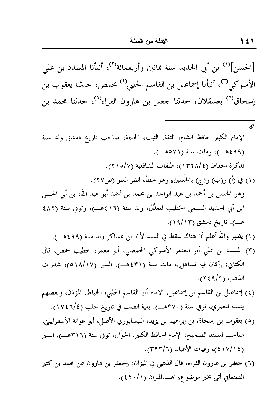 1 في (أ) و (ب) و (ج) "الحسين" وهو خطأ، انظر العلو (ص27) .وهو الحسن بن أحمد بن عبد الواحد بن محمد بن أحمد أبو عبد الله، بن أبي الحسن ابن أبي الحديد السلمي الخطيب المعدَّل، ولد سنة (416هـ) ، وتوفي ستة (482هـ) . تاريخ دمشق (13/19) .