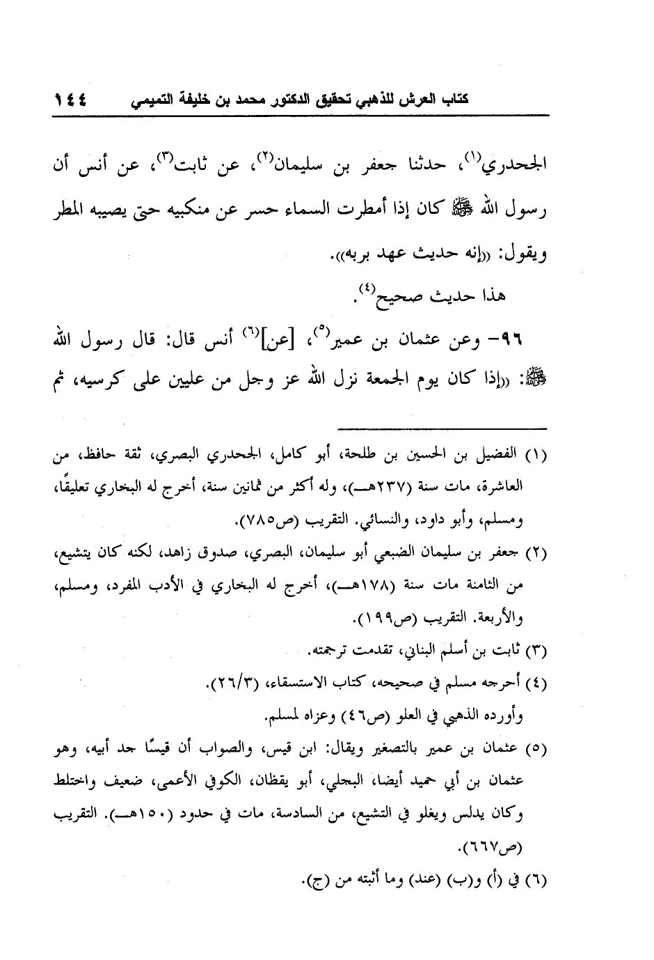 96- وعن عثمان بن عمير5، [عن] 6 أنس قال: قال رسول الله صلى الله عليه وسلم: "إذا كان يوم الجمعة نزل الله عز وجل من عليين على كرسيه، ثم